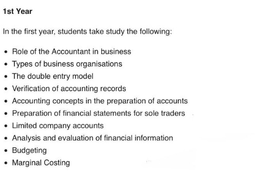 第二年学习标准成本计算法和变量分析,归纳成本计算法和基于活动的成本核算,资本投资评价,针对机构的会计和不完整的会计记录,针对有限公司的会计,会计信息的解读、分析和沟通,职业道德的影响。