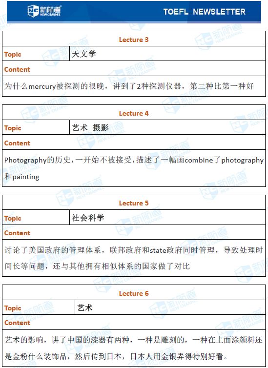 听力的lecture部分考了艺术、自然科学、、社会科学、天文学、生物学等等。