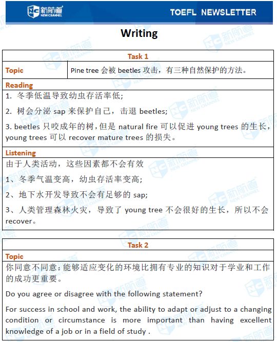 综合写作topic:松树被甲虫攻击,有三种自然保护的方法。阅读部分提出3种自然保护方法:1. 冬季低温导致幼虫存活率低; 2. 树会分泌sap来保护自己,击退beetles; 3. beetles只咬成年的树,但是natural fire可以促进young trees的生长,young trees可以recover mature trees的损失。听力部分反驳阅读部分,认为这3种方法无效。