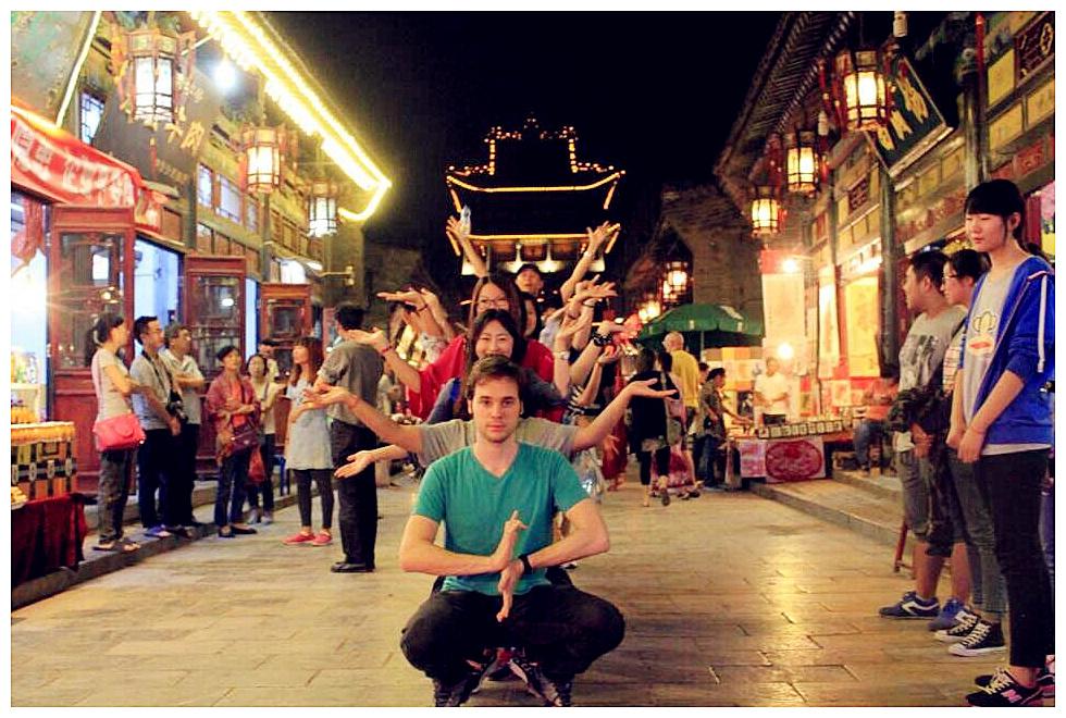 迈过墙上稀稀落落长满了草的古城墙,缓缓步入静谧又稍显古老的平遥,虽然一些宅院被开发作为了店铺或者酒吧,但仍然可以感受到古城的宁静和祥和,仿佛与喧嚣世界隔离开来。登上古城城楼,俯瞰整座古城,只见高高低低房顶错落有致,和暖暖的橙色的夕阳相交相辉映,似乎诉说着古城曾经的繁华。夜幕降临,大大小小店铺的灯都亮了起来,五彩缤纷,别有一番味道。这时候,老师们纷纷走出客栈,漫步走在主干道上,看看古朴雅致的手推漆工艺品,想象着十六七岁姑娘用手搓着头发打磨漆器的样子;尝尝鲜美多汁的古城牛肉,想象着一家人围坐在桌子前品味牛肉的情景;试试典雅特色的古城旗袍,想象着那时的姑娘走在铺满青砖的道路上蹙眉的一笑。也有老师走进了乐器店和具有当地特色的酒吧,品味不一样的音乐和酒香。