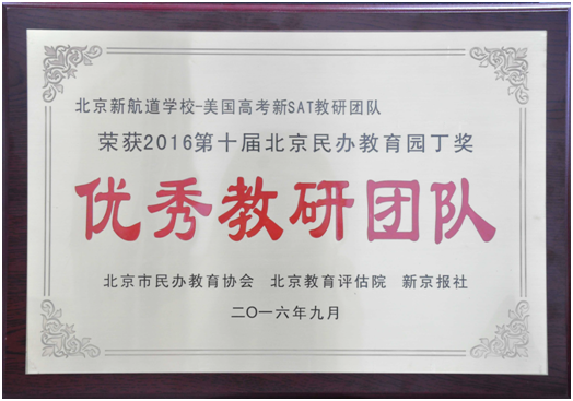 2016年9月9日,新航道美国高考新SAT教研团队荣获“第十届北京民办教育园丁奖教研团队奖”。民办教育园丁奖活动由北京市民办教育协会、北京教育评估院、新京报社组织,已经成功举办十届,成为我国民办教育事业丰碑式的行业大事件。新航道缔造新SAT培训新标准!精品教学、精致服务,因为专业,所以权威!新航道坚持为学生而办学,让教育回归本质。