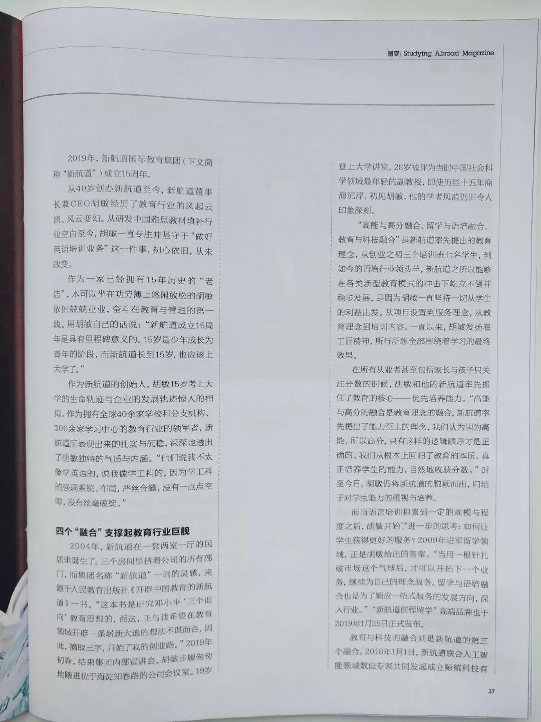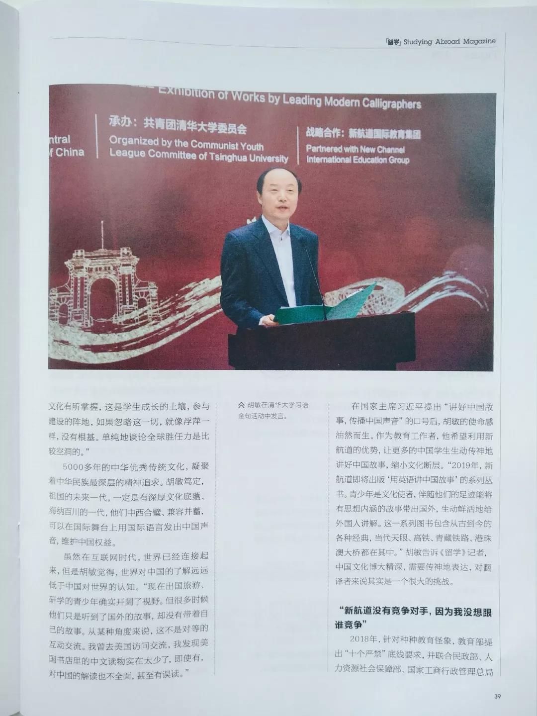 在主席习近平提出“讲好中国故事,传播中国声音”的口号后,胡敏的使命感油然而生。作为教育工作者,他希望利用新航道的优势,让的中国学生生动传神地讲好中国故事,缩小文化断层。“2019年,新航道即将出版‘用英语讲中国故事’的系列丛书。青少年是文化使者,伴随他们的足迹能将有思想内涵的故事带出国外,生动鲜活地给外国人讲解。这一系列图书包含从古到今的各种经典,当代天眼、高铁、青藏铁路、港珠澳大桥都在其中。”胡敏告诉《留学》记者,中国文化博大精深,需要传神地表达,对翻译者来说其实是一个很大的挑战。