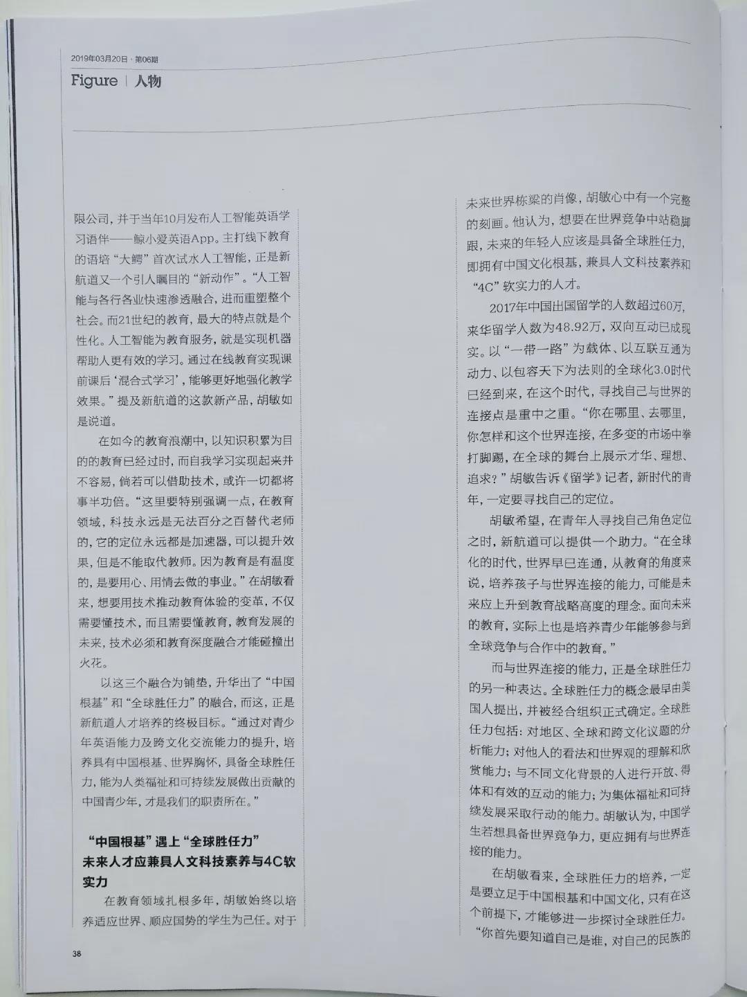 胡敏老师荣登光明日报《留学》杂志2019年第6期封面