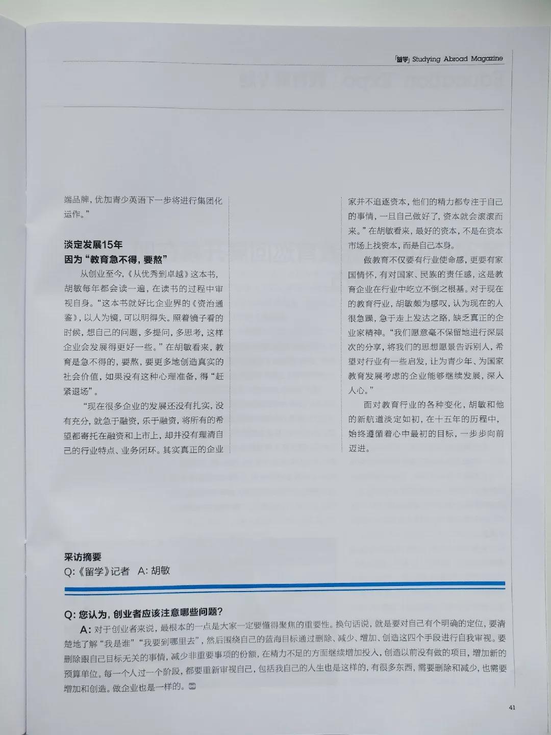 做教育不仅要有行业使命感,更要有家国情怀,有对、民族的责任感,这是教育企业在行业中屹立不倒之根基。对于现在的教育行业,胡敏颇为感叹,认为现在的人很急躁,急于走上发达之路,缺乏真正的企业家精神。“我们愿意毫不保留地进行深层次的分享,将我们的思想愿景告诉别人,希望对行业有一些启发,让为青少年、为教育发展考虑的企业能够继续发展,深入人 心。”