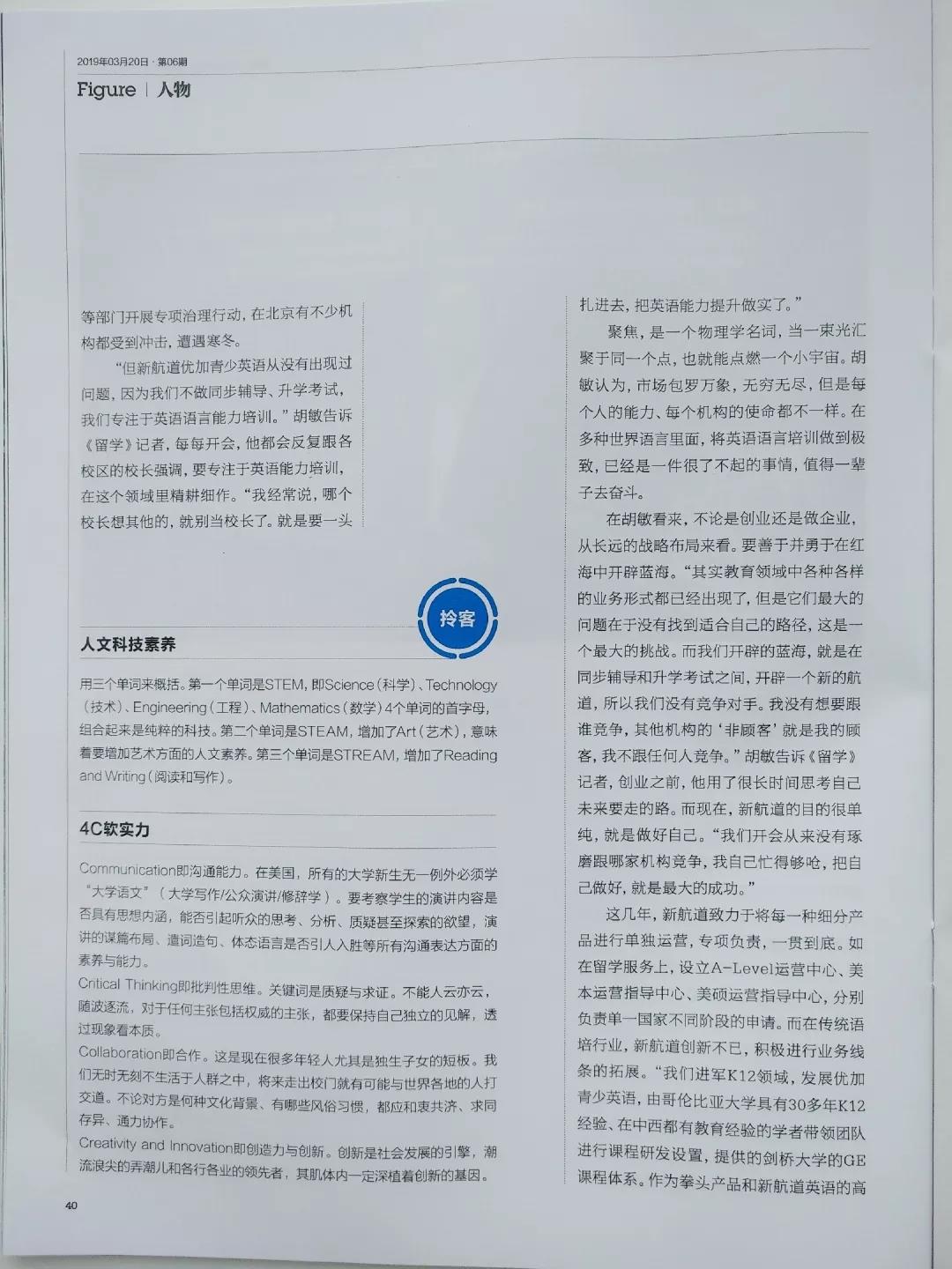 胡敏希望,在青年人寻找自己角色定位之时,新航道可以提供一个助力。“在全球化的时代,世界早已连通,从教育的角度来说,培养孩子与世界连接的能力,可能是未来应上升到教育战略高度的理念。面向未来的教育,实际上也是培养青少年能够参与到全球竞争与合作中的教育。”