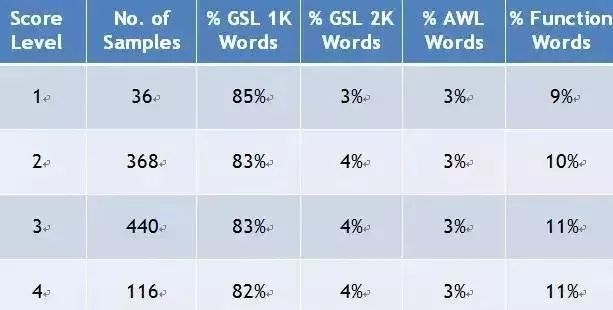这是出自同一篇ETS的研究报告,仍然是选取了同样的样本。只不过这次统计的是每个分数段中答题录音的词汇构成并分为General Service List 1k(1000), 2k(2000), Academic Word List和 Function words 几种类型。