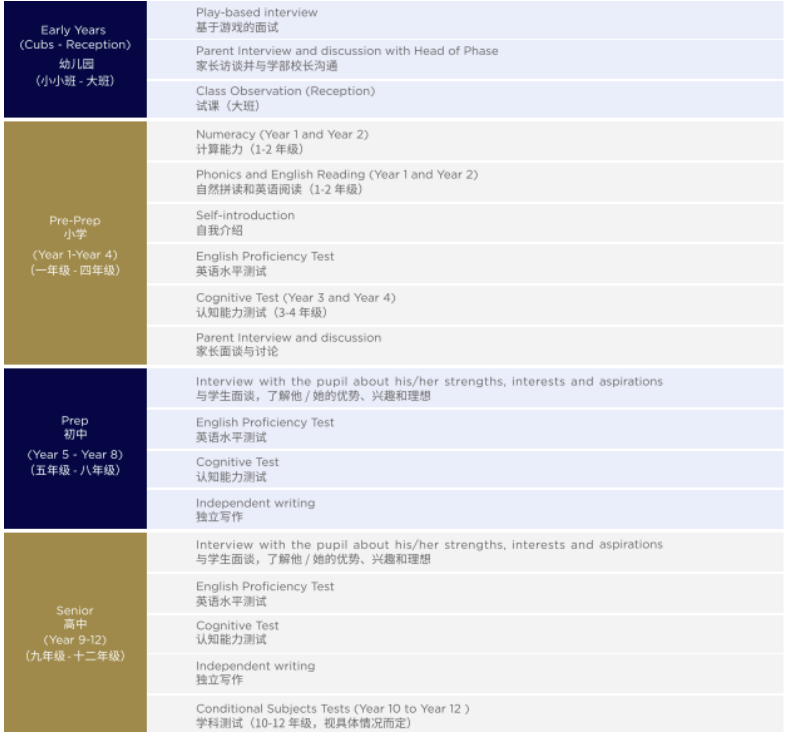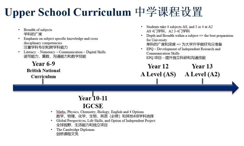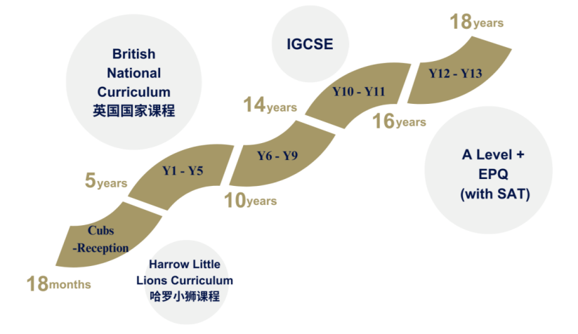 18 个-18 岁,16 年级英国国家课程+A Level (可以校内考 SAT) 包括 1-9 年级中国国家语文课程 小班化教学 (幼儿园 1:4,小学 1:8, 中学 1:7 学院导师制度。学校采用企业 微信和家长一对一沟通。 幼儿园小学 4 点放学,中学 6 点放学。学术扎实+全人精英教育,领导力培 养。