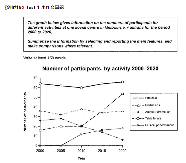 本题是《剑19》test 1,本题的难点在于项目种类多(有5组之多),这也造成考生在描写图表数据时很难分段。本题采用训练营和《细说雅思写作》里讲到的常用分段思路——按照变化趋势分段,将变化趋势相似的film club和martial arts分为一组,剩下的3个项目分为一组。