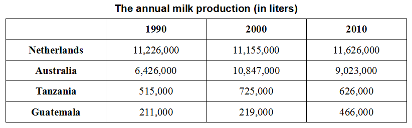 The table compares the annual production of milk in Netherlands, Australia, Tanzania and Guatemala in 1990, 2000 and 2010.