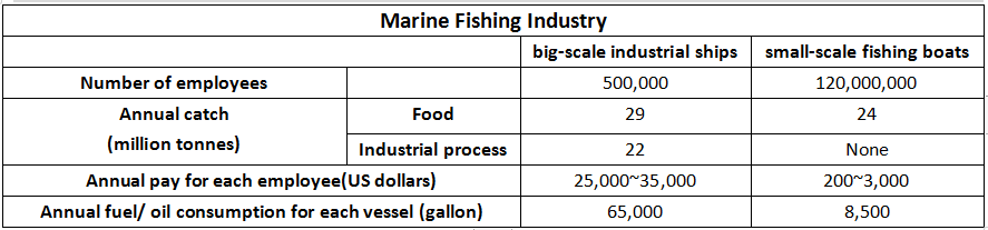 We can also find that compared with employees of large ships who earned an annual salary of $25,000~$35,000, people working in small-scale fishing boats got lower annual pay($200-$300). Also, 65,000 gallons of fuel was needed for a larger vessel, whereas for a smaller vessel, only 8,500 gallons were necessary.