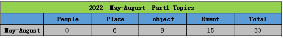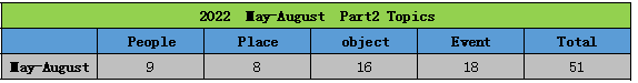从一览表可以看出, 本季Part2话题的总数不多,与往季动辄50+甚至60+的题量来说,算是减少了很多。 与Part1话题分配比例相似,事件类和物品类Part 2话题占多数,人物类和地点类话题相对较为稳定。