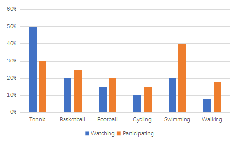 Tennis and swimming both draw immediate attention, as one had the largest viewing figure, attracting 50% of audiences, while the other witnessed the highest participation rate(40%). It is also worth mentioning that tennis was the only sports whose viewing figure had an apparent advantage over the participation rate. Meanwhile, a similar gap of 20% was also observed between the two figures for swimming.