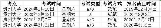 2020年1-12月贵州大学雅思考点