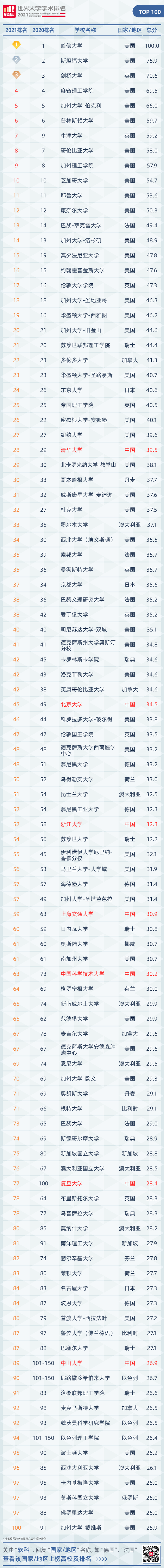 软科世界大学学术排名(ShanghaiRanking’s Academic Ranking of World Universities,简称ARWU)是世界范围内综合性的全球大学排名,2003年首 次发布。