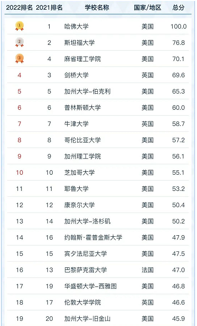 哈佛大学仍然稳坐头把交椅,连续20年蝉联全球第 一;