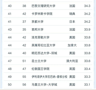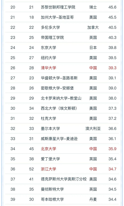 中国的清华大学(第26名),北京大学(第34名),浙江大学(第36名)进入全球Top 50之列。