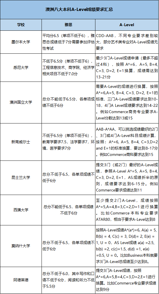 以澳洲八大为例,各自的A-Level成绩要求如图所示:
