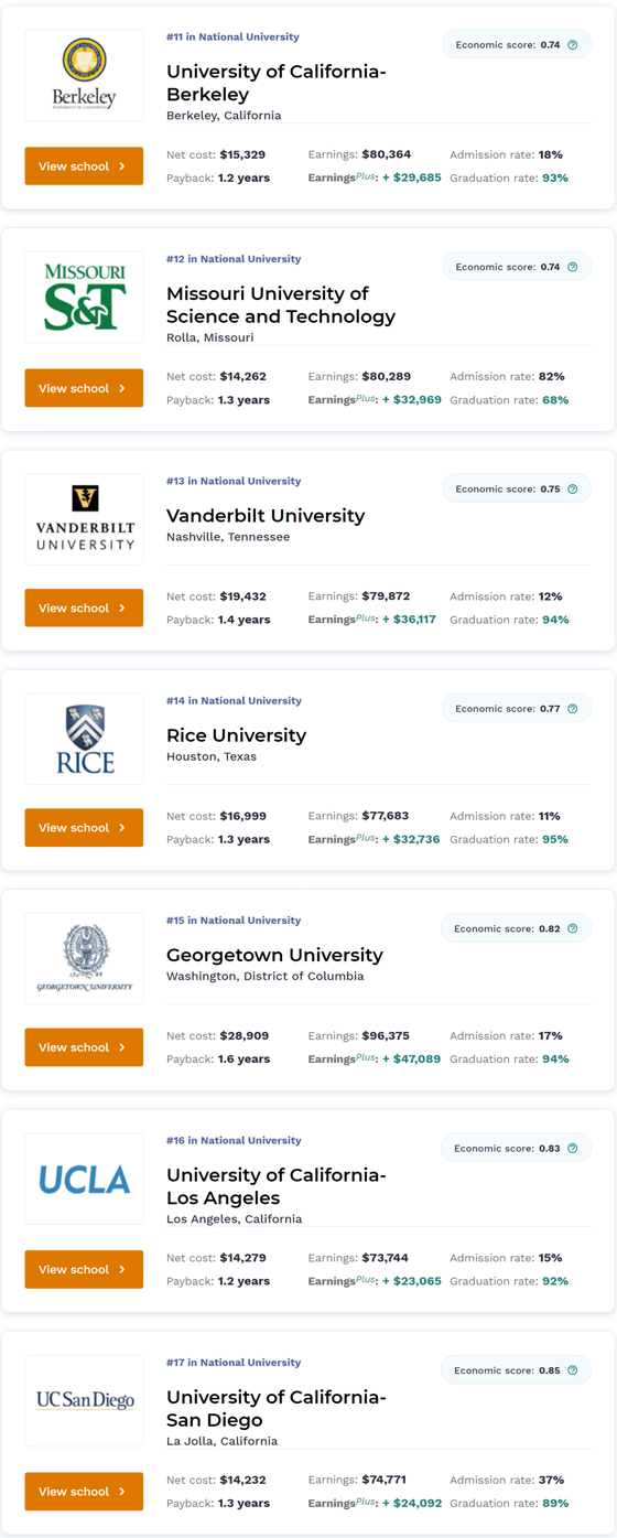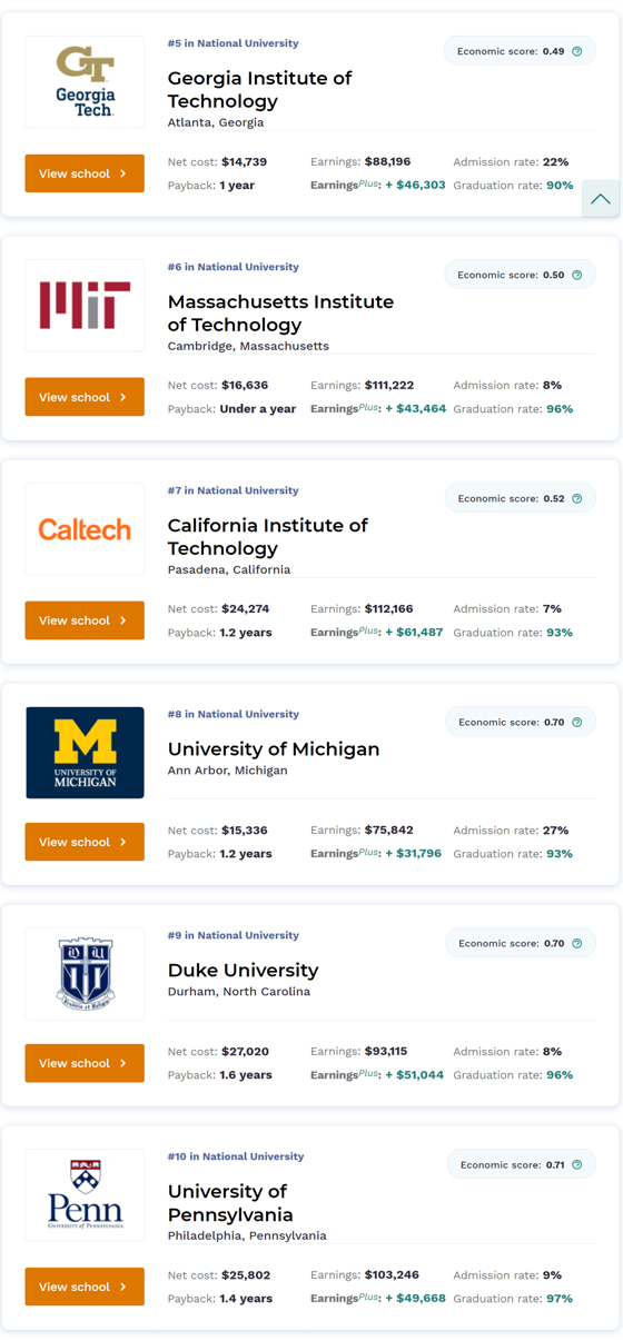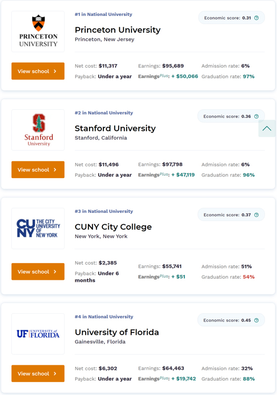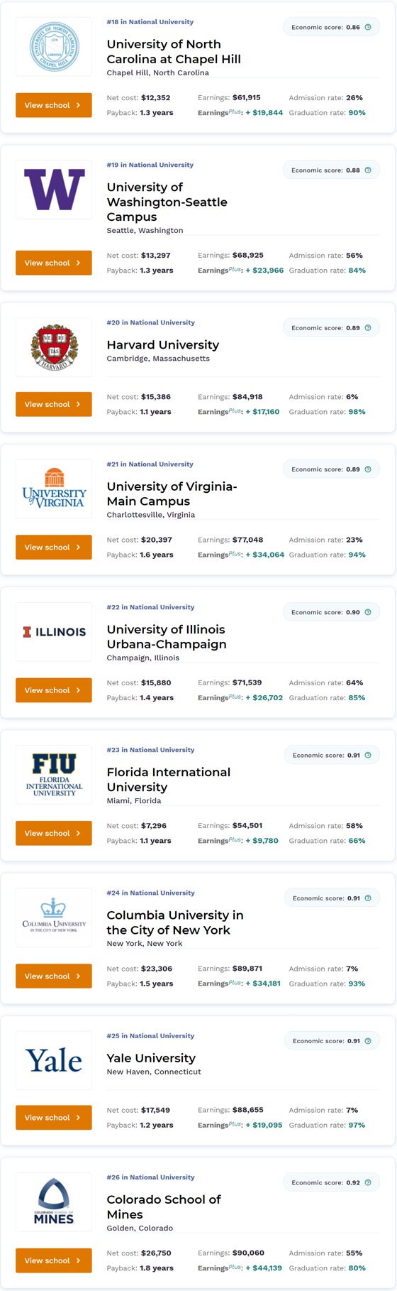 相反来看,在各大榜单上耀眼的哈佛、哥大、耶鲁等藤校,在这次经济回报排名中却垫了底,分别位列本榜末尾的第20、24和25名。