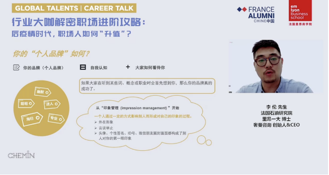 近日,法国里昂商学院与中国留法校友会合作推出“乌卡时代,如何突破职场瓶颈”主题分享,并通过法国里昂商学院官方微信视频号和留法校友会B站同步直播。活动特邀法国里昂商学院全球人力资源与组织创新中心副主任、Global DBA博士学员钱国新,依视路陆逊梯卡大中华区人力资源副总裁、法国里昂商学院企业导师梁晓云及奢曼管理咨询有限公司创始人&CEO李伦三位职场大咖,从个人与企业双重视角出发,就「企业如何识别高潜人才」和「如何建立职场的不可替代性和核心竞争力」等问题发表了自己的见解,助力职业发展。