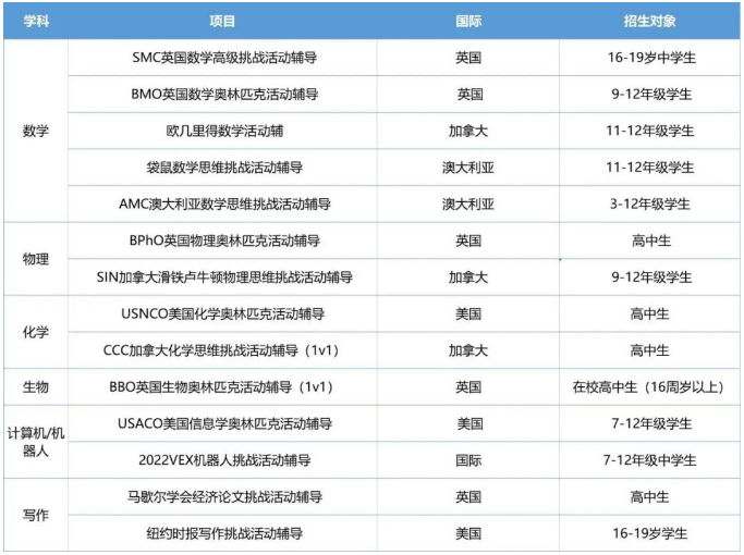 BPHO全称British Physics Olympiad,英国中学物理奥林匹克活动,适用于想要将来学习物理/天文/工程类/计算机等专业。物理类含金量最 高的国际活动之一,其考试题目和牛剑笔面试也有一定的相关性,BPhO中国赛区的获奖者还有机会获邀参加选拔英国物理活动国家队的英国物理奥赛集训营(中国赛区),有能力的学生可以尝试参加。