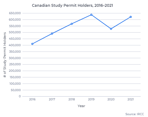 下图显示了过去六年来,加拿大国际学生数量的变化。在2021年,加拿大的国际教育已经迅速恢复到疫情前的水平,国际学生人数上升了近18%。