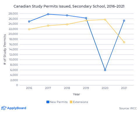 加拿大的国际中学生人数占整个加拿大中小学国际学生市场总人数的64%,并且占2021年新签发的加拿大所有层次学习许可数量的8%。下图显示了2016年至2021年间,加拿大颁发给国际中学生的学习许可数量: