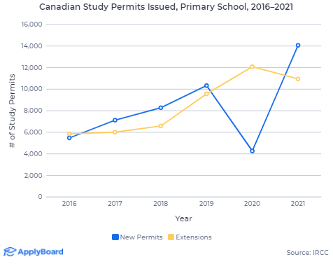 在2021年,加拿大发放给国际小学生的新学习许可数量为14,065份,比2020年增加了9,801份,增长了 230%,增幅接近中学板块(325%)。