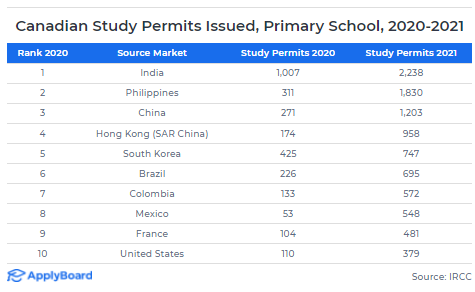 下表显示了2020年和2021年,加拿大颁发的国际小学生,新学习许可和学习许可总数排名前10的生源国数据。