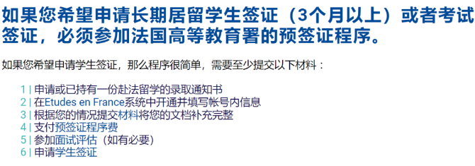 自2022年4月27日起,法国长期学生签证(3个月以上)的申请人必须在法国签证官方网站FRANCE VISA平台上创建账号。也就是说,除了在法国高等教育署系统中递交材料,进行预签证程序之外,还需要在法国签证官方网站上递交材料,并进行接下来的面试签证申请步骤。法国留学生长期签证的办理总体来说分为面签+递签两个环节。、