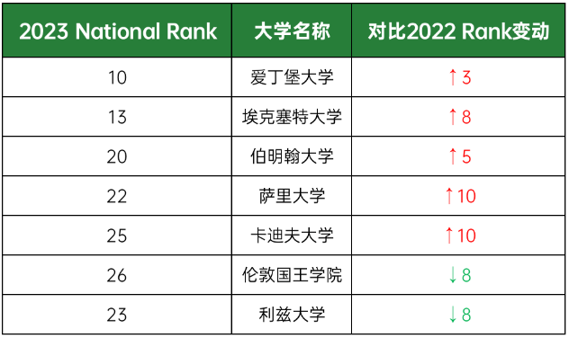 整个榜单中进步较大的学校有:埃克塞特大学(上升8位)、伯明翰大学(上升5位)、萨里大学和卡迪夫大学(均上升10位)。