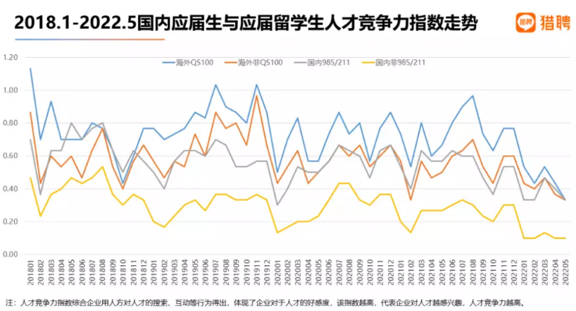 从 2018 年 1 月至 2022 年 5 月,国内外应届生的竞争力指数排序大致是: