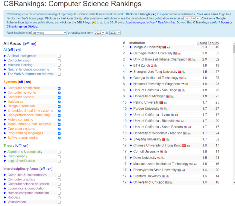 CS Rankings排名体系是由美国麻省理工学院计算机科学教授Emery Berger发起的排名榜单。