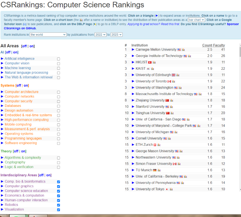CS Rankings在进行具体排名时,分为AI、理论、系统、交叉学科四大板块,每个板块下又细分若干个子方向。