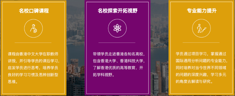 由香港中文大学相关领域的资 深名 师主讲,为学员带来专业、前沿的课程,帮助学员更好的了解香港中文大学的教学内容和风格;
