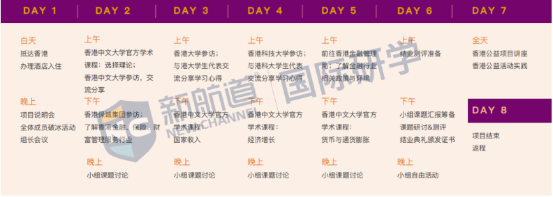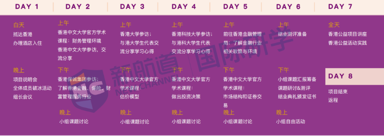 项目由官方学术课程、香港名 校探校、企业及机构参访、小组展示、 公益实践等模块组成。
