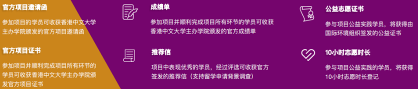 营员收获:港中文官方课程证书、成绩单、推荐信( 20%)、国际环境志愿证书、10小时志愿时长
