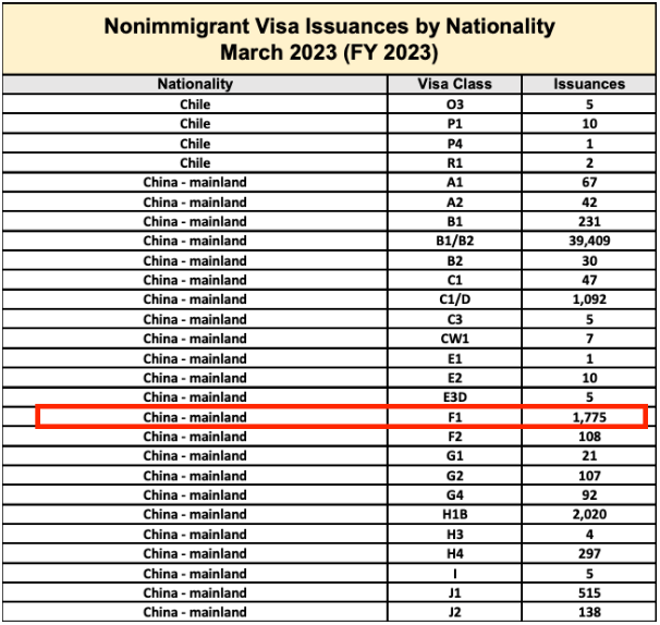 根据美国国务院发布的美海外各使领馆签赴美签证数量报告显示:2023年一季度,共有5413名中国大陆籍学生获得赴美留学F1学生签证!