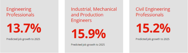 也因如此,工程师在全球各地都是备受追捧的“香饽饽”~以澳大利亚为例,根据国家技能委员会的预测,工程相关岗位的就业增长到2025年将达15%左右!