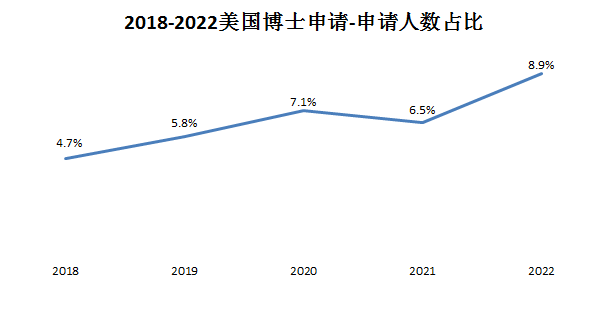 另外,数据显示,25岁及以上硕博留学意向人群呈上升趋势,尤其是近五年来,申请美国读博的中国学生数占比呈现上升趋势,并在2022年达到了峰值。