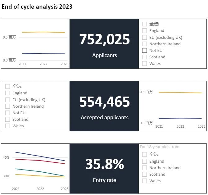 2022-2023申请季,UCAS申请人数为752,025人,共有554,463人被录取,整体录取率73.7%。