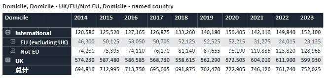 2023年入学季共有752,025人通过UCAS系统递交了申请,其中国际学生有152,100人,中国大陆学生申请人数为33,195人。中国大陆地区依然是申请数量最多的海外生源地。