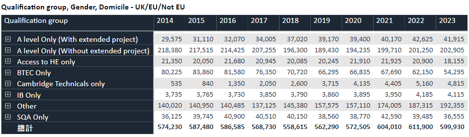 A-Level成绩证书仍旧是最主要的申请证书,提供A-Level+EPQ的申请人数为41,915人,提供A-Level但无EPQ的申请人202,905人;用IB成绩申请的人数4,115人。