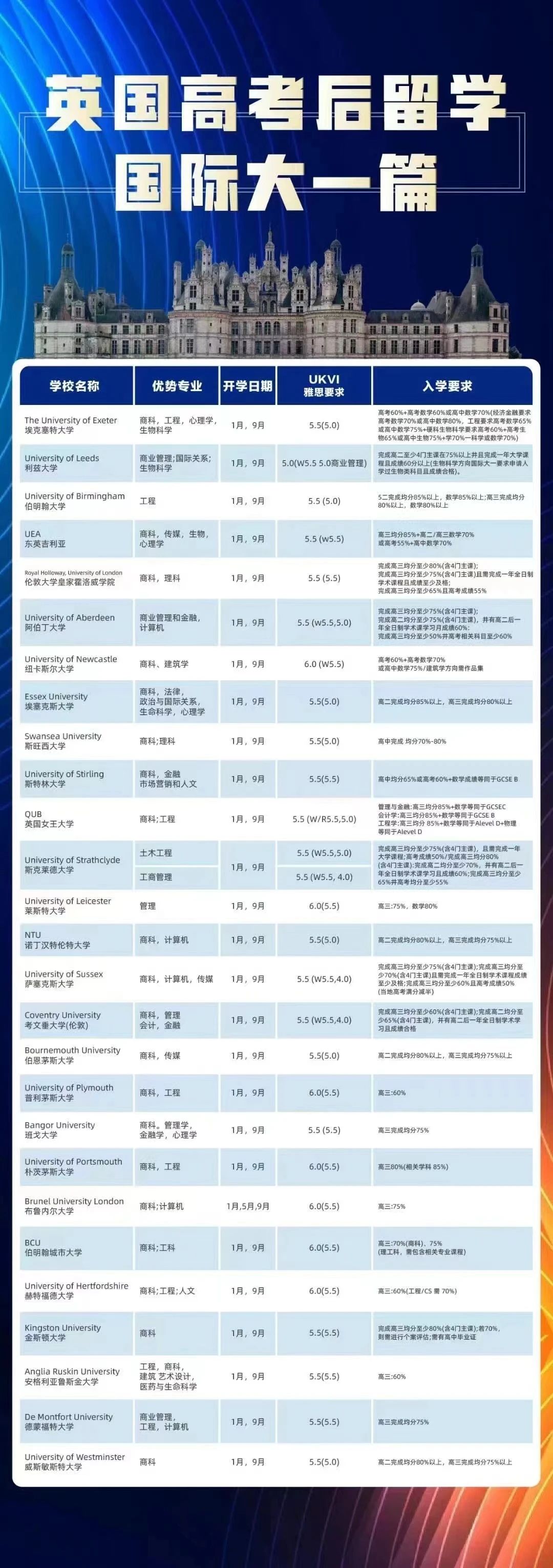 越来越多的英国大学承认国内高考成绩,学生可凭高考成绩直接申请入读英国大学的本科课程,也不用进行额外的准备,又节约时间,三年即可获得英国本科学位,高考后无缝衔接英国大学。