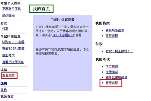 3、在“我的首页”点击“查看成绩”进行托福考试成绩查询。