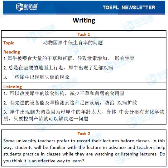 综合写作topic:动物园犀牛低生育率的问题。阅读部分提出犀牛生育率低的三点原因。听力部分针对三点原因提出了三个解决方法。