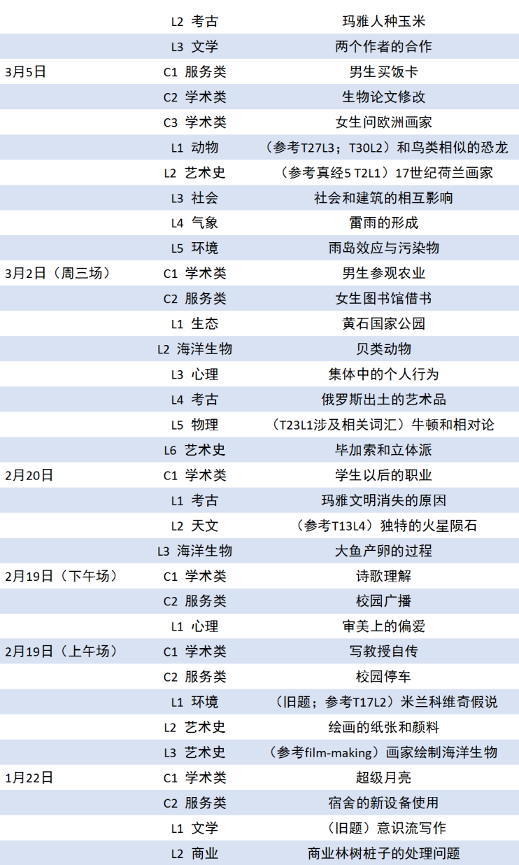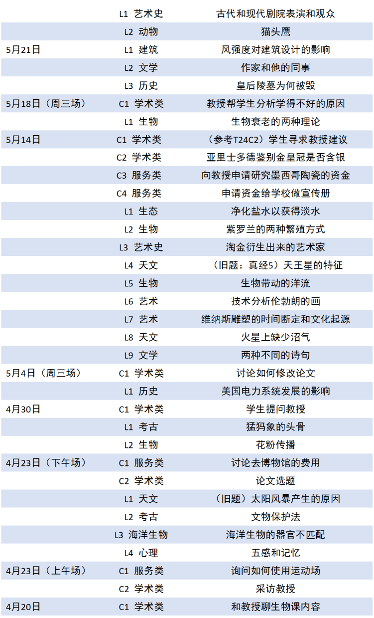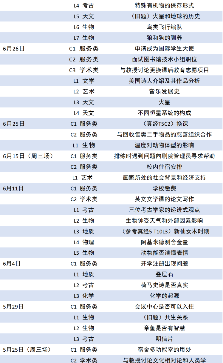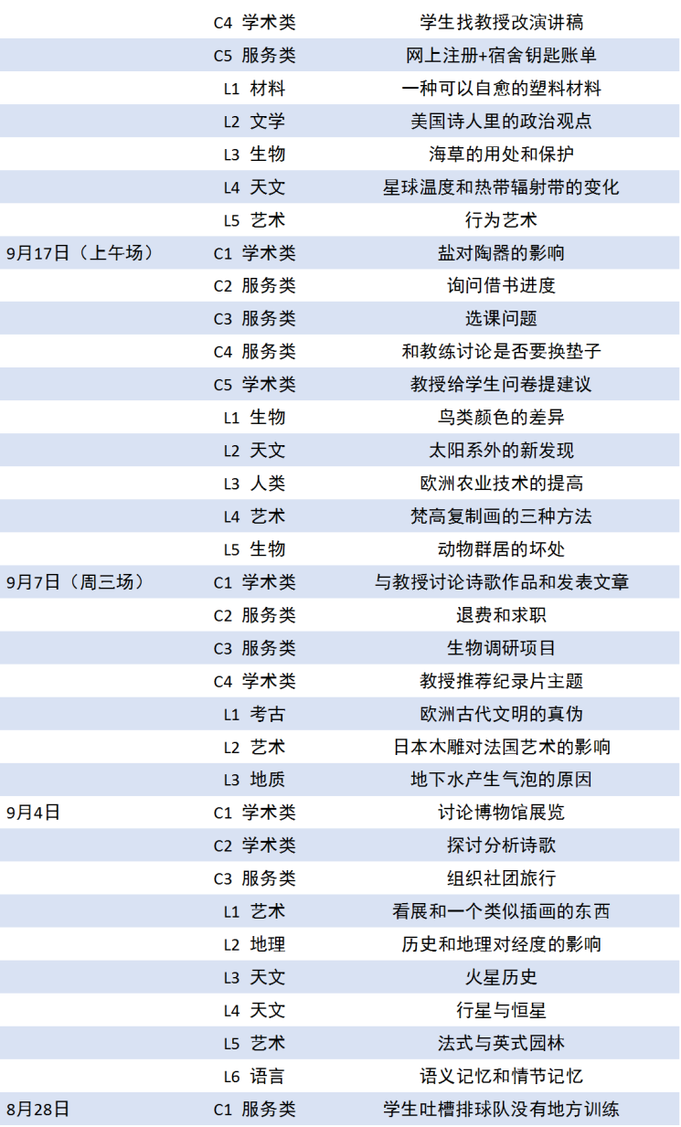 对话总结及备考建议综合来看,2022年1-9月大陆地区线下考试对话部分服务类和学术类的出现频率近乎相同,单次考试不涉及加试的情况下,基本还是保持一篇office hour类型对话 + 一篇service encounter类型对话,其中考到的话题和场景也没有非常出人意料的,都有涵盖在TPO或《托福听力真经》中。校园生活类对话最常考的场景是停车及其相关衍生话题、宿舍问题、社团活动,学术类对话最常考的场景是课程内容讨论、学术论文讨论、课后项目讨论。