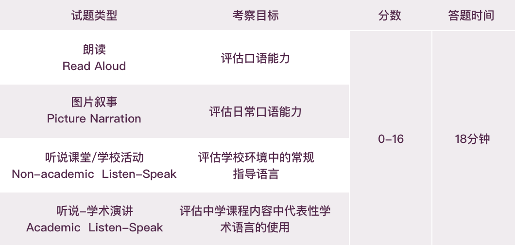 口语:口语考试为网上测试,包含4道题目,旨在测试学生在社交、校园场景及学术背景下的口语表达能力。