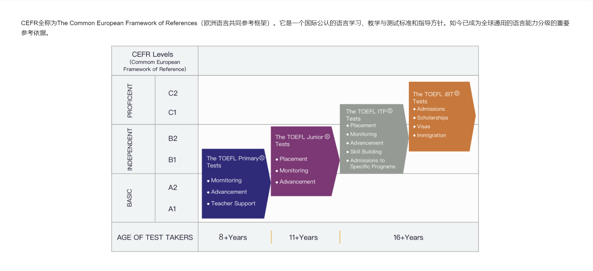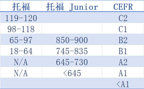 这里又要用到CEFR的评分等级,小托福和托福对应的CEFR等级如图。图中可以看出小托福等级为B2,分数范围850—900分,对应托福的中等水平65—97分,所以对于后续的留学规划,我们建议同学们达到小托福的B1-B2水平再去准备托福考试。