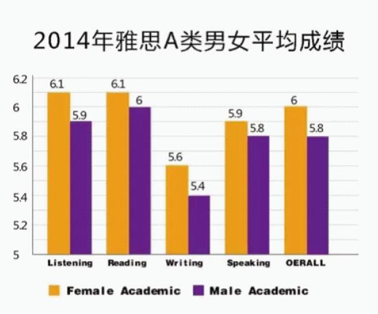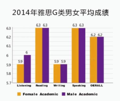 与2013 年全球雅思G 类考试相比,女性考生的平均成绩由6.1增加到6.2 分,与男性平均成绩持平。男女听力的平均成绩均下降0.3分,而阅读成绩则由5.8-5.9 分上升至6.3 分。