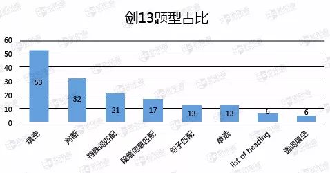 首先,从图中我们可以看出,填空题依旧是占比重的题型,题量为53道,占全部剑13真题的33%,仍旧占领着霸主的地位,与其在剑12中的占比情况基本一致(占比35%)。